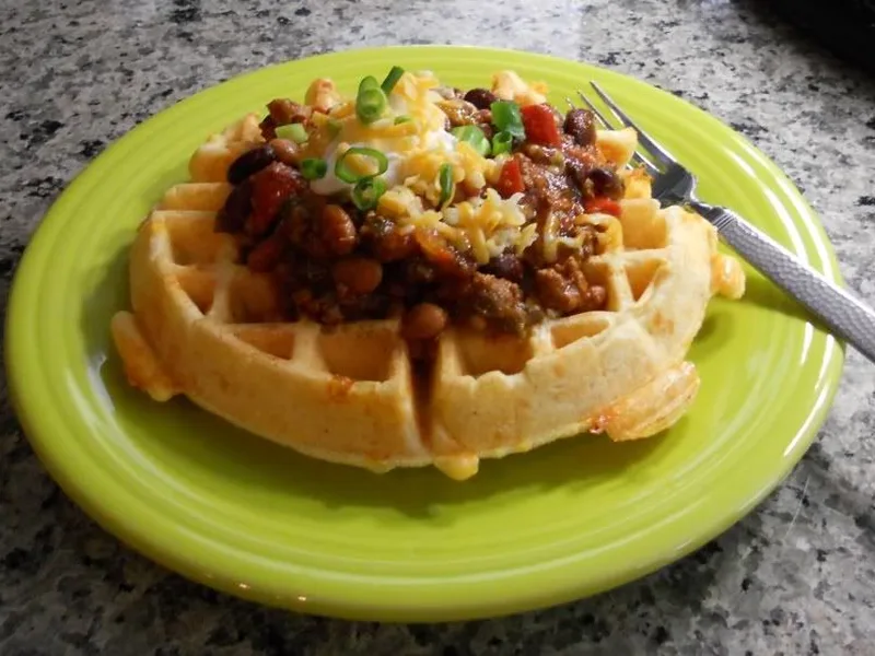 Ladle into bowls over double-fried french fries. Garnish with saltine crackers, sliced green onions, and shredded cheddar cheese.
