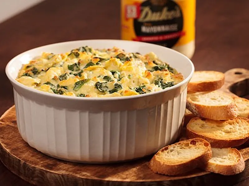 Creamy spinach and artichoke dip made with Duke's Mayonnaise and Parmesan cheese. Chopped artichoke hearts combine with frozen spinach in a rich, baked appetizer that bubbles golden in the oven. Quick-prep comfort food ready in under 30 minutes.
