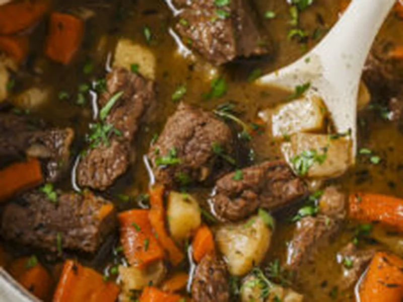 This hearty beef stew combines tender chuck roast with sweet potato, parsnips, and carrots in a rich wine-spiked broth. The Dutch oven method creates perfectly braised beef while the arrowroot starch provides natural thickening without gluten. Root vegetables add natural sweetness and substance, making this a satisfying one-pot meal perfect for cold weather. The long, slow braising ensures melt-in-your-mouth beef and deeply developed flavors throughout.