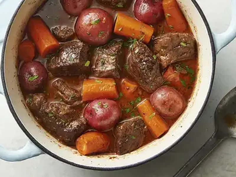 This hearty Dutch oven pot roast transforms tough chuck roast into tender, fall-apart beef through slow simmering in a savory tomato-soy glaze. Baby red potatoes and carrots cook alongside the meat, absorbing rich flavors from the braising liquid. The final step reduces the cooking liquid into a thick, flavorful sauce that coats every bite. Perfect for Sunday dinners or cold weather meals when you want something comforting that fills the house with amazing aromas. Fresh parsley and thyme add a bright herbal finish to this classic one-pot meal.