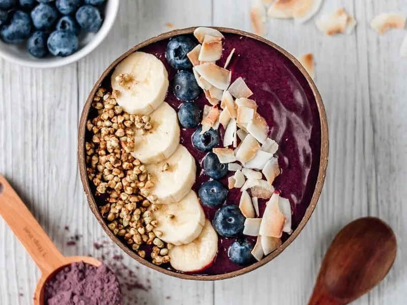 A quick blended acai bowl combining frozen blueberries, strawberries, ripe banana, and acai powder with citrus juice. Blend smooth and top as desired. Ready in minutes for a refreshing breakfast or snack.