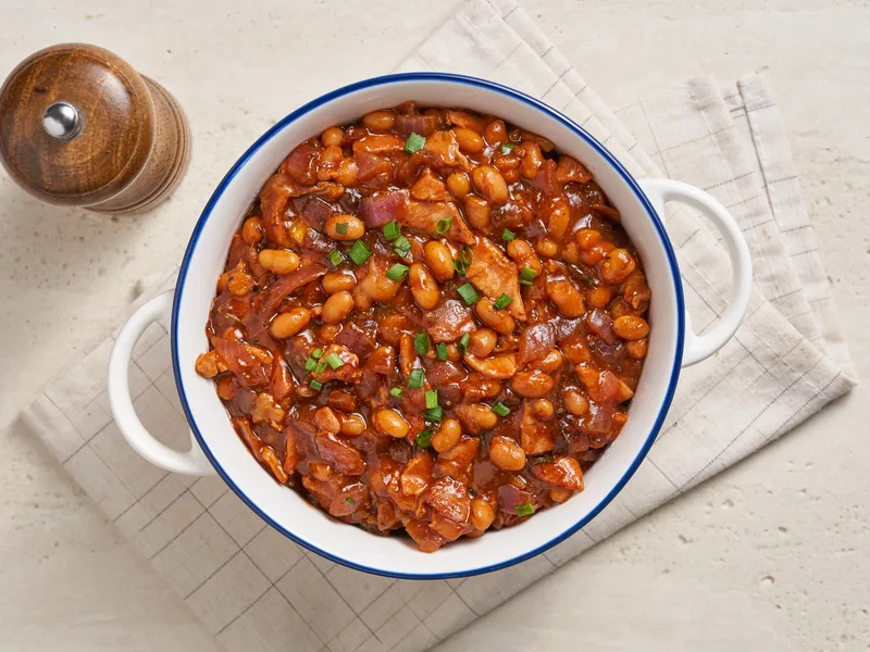 Smoky baked beans enriched with crispy bacon, caramelized onions, and a tangy-sweet sauce of barbecue, Worcestershire, apple cider vinegar, and dark brown sugar. Smoked paprika adds depth. Quick stovetop method delivers tender beans with bacon grease infused throughout, finished with fresh scallion garnish.