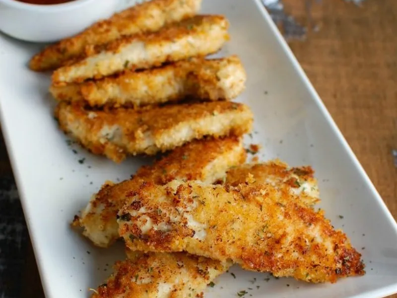 Crispy-coated chicken tenders baked rather than fried for a lighter weeknight dinner that delivers satisfying crunch without the mess. This recipe combines panko breadcrumbs with Parmesan cheese and warm spices—garlic powder, thyme, parsley, and paprika—for golden, flavorful coating that adheres to moist chicken. The oil-dredging method creates crispness rivaling fried versions while keeping prep minimal and cleanup easy. Perfect for families with picky eaters, lunch boxes, or anyone craving comfort food fast. Serve with ketchup, honey mustard, or your favorite dipping sauce. The wire rack tip enhances results, ensuring even browning and airflow. This straightforward approach skips breadcrumb-egg-flour breading stations, making it ideal for busy cooks who want restaurant-quality texture in under 30 minutes.
