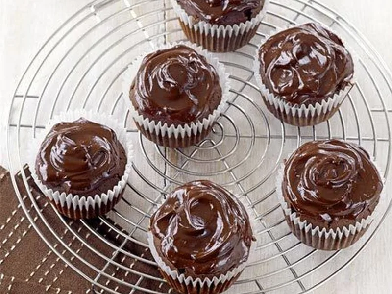 Rich chocolate cupcakes made with cocoa powder and melted dark chocolate, filled with chocolate pieces that create pockets of texture. A soured cream batter keeps them moist, topped with a smooth chocolate ganache icing. Ready in under an hour.