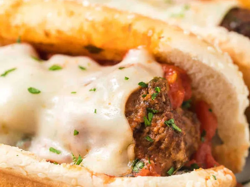 Tender ground beef meatballs simmered in crushed tomato sauce for hours in a crockpot, then nestled into hoagie buns with melted mozzarella. Brown the meatballs first for deeper flavor before letting them cook low and slow until fall-apart tender.