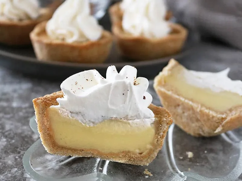 Individual custard pies featuring warm spices: cardamom and nutmeg in a silky filling, with a buttery almond-flour crust. Crisp pastry shell gives way to creamy, aromatic custard. Baked in a muffin tin for convenient single servings. Best served slightly warm with whipped cream.