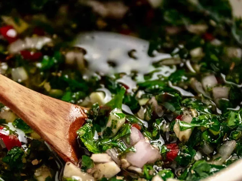 A vibrant, herbaceous chimichurri with fresh parsley, garlic, red chilis, and oregano finished with red wine vinegar and olive oil. Chill for 30 minutes to 2 hours to develop flavor. Versatile for fish, burgers, marinated meats, or vegetable dipping.