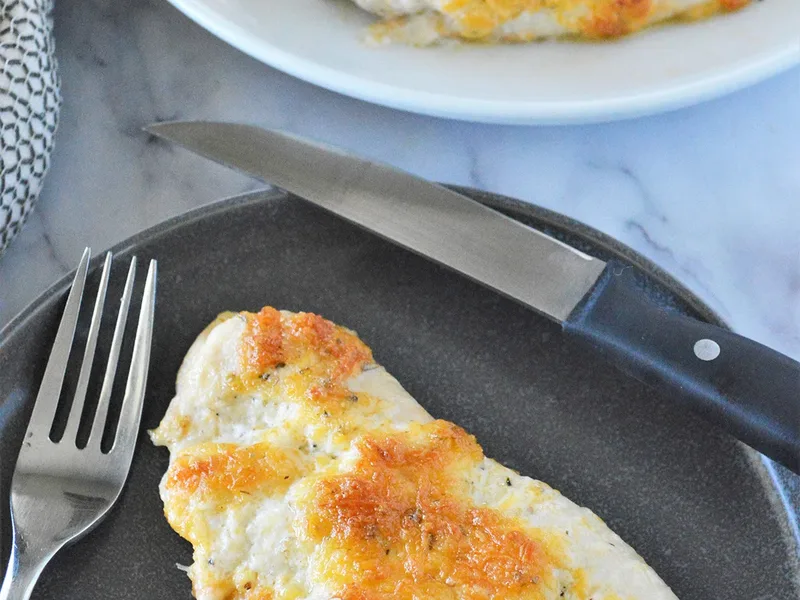 Pounded boneless chicken breasts topped with a creamy mayo-cheddar mixture and baked until golden. Quick weeknight dinner with minimal prep. The mayo and cheese create a flavorful, protective crust that keeps the chicken moist while baking to safe internal temperature.