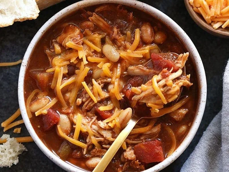 This hearty chicken chili combines tender shredded chicken with black beans, white northern beans, and diced tomatoes in a flavorful blend of chili powder, cumin, and smoked paprika. Cooked entirely in the slow cooker for hands-off convenience, it develops rich, warming flavors over hours of gentle simmering. The addition of salsa and green chiles provides a mild kick while apple cider vinegar brightens the overall taste. Perfect for busy weeknights, meal prep, or feeding a crowd, this protein-packed chili pairs beautifully with toppings like shredded cheese, Greek yogurt, and fresh avocado for a satisfying comfort meal.
