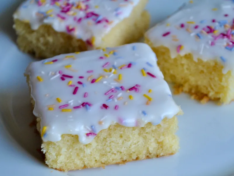 A nostalgic sheet cake that brings back school dinner memories with its simple, foolproof sponge and bright sprinkle topping. This crowd-pleasing tray bake uses the creaming method to combine butter and sugar into a light crumb that stays moist for days. The contrast between soft vanilla sponge, smooth icing, and crunchy sprinkles delivers the comfort and joy of a classic British school cake. Ideal for bakers of any skill level, especially those introducing children to cake-making, it's perfect for lunchboxes, potlucks, or afternoon tea. What sets this version apart is its flexibility—bake as one tray, cupcakes, or individual portions—and the forgiving nature of the recipe, which works with pantry staples. The optional custard serving enhances it to a proper dessert experience rather than just a sweet treat.