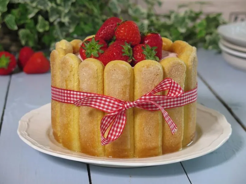 A chilled strawberry charlotte layered with lime-soaked ladyfingers, strawberry-gelatin mousse, and whipped cream. Set overnight for a silky, elegant dessert requiring no oven. Fresh strawberries decorate the top.