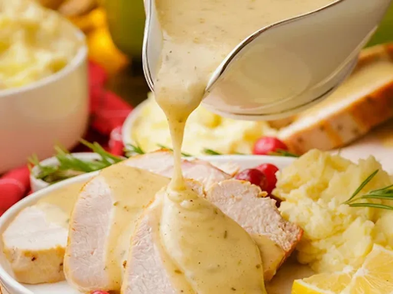 This rich, velvety gravy combines butter, flour, and aromatic herbs with white wine and turkey stock for exceptional flavor. The wine adds depth while rosemary, sage, and thyme create the perfect herb blend. Ideal for Thanksgiving dinner, holiday meals, or any time you want restaurant-quality gravy at home. The roux technique ensures a smooth, lump-free texture every time.