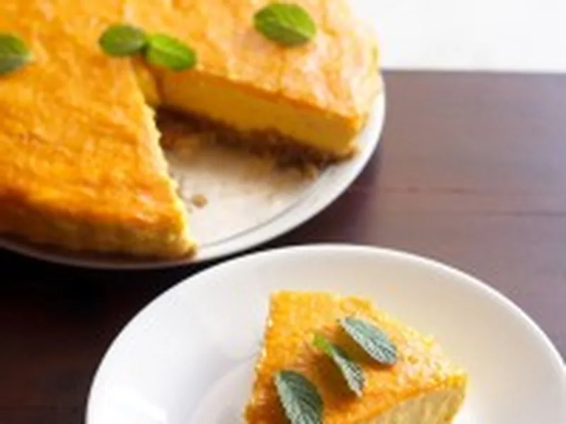 Eggless layered cheesecake featuring a buttery cracker crust, creamy mango-cream cheese filling, and fresh mango-agar topping. Alphonso mangoes create a sweet, smooth middle layer with firm texture, while agar agar provides vegetarian gel structure. Chilled for 3-4 hours until set. Topped with whipped cream, fresh mango, and mint.