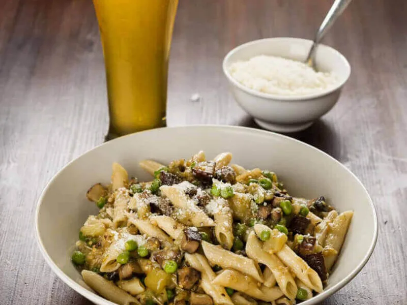 Sautéed portobello mushrooms and eggplant simmered in beer with rosemary, combined with penne and peas. The vegetables become tender while the liquid reduces, creating a light sauce. Finished with vegan Parmesan cheese and suited to Vienna lager or golden ale pairings.