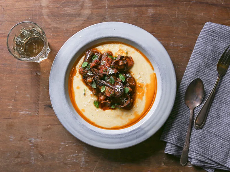 Silky polenta finished with cold butter provides a luxurious base for a complex eggplant ragout built from seared baby eggplant coins, a pureed eggplant foundation, tomatoes, and bright herbaceous notes. Red wine deglazes the pan, lemon and honey balance acidity, and fresh basil and parsley are stirred in off heat to preserve their color and flavor.