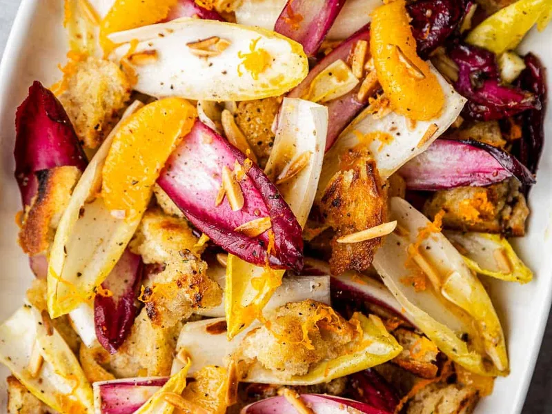 Crisp Belgian endive meets toasted bread with fresh rosemary, bright citrus segments, and shaved Parmesan in a garlicky anchovy vinaigrette. The interplay of bitter greens, citrus acidity, and nutty croutons creates a sophisticated starter or light lunch. Serve cold as a composed salad that balances textures and flavors. This version emphasizes fresh orange juice and zest for vibrant citrus notes while anchovy adds umami depth.