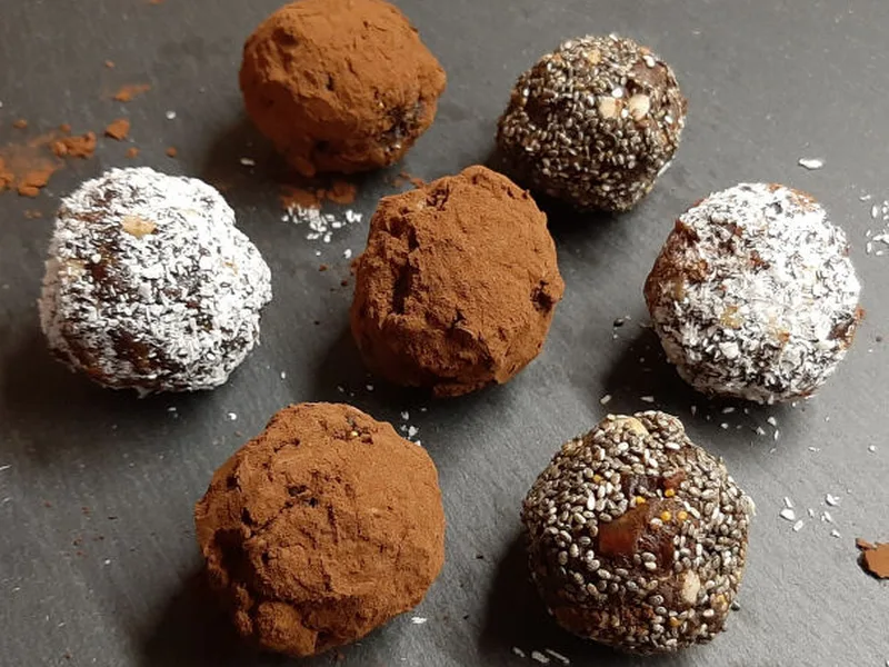 No-bake vegan energy balls made from dates, nuts, and cocoa powder with vanilla. Mix ingredients in a food processor, roll into balls, and coat with optional toppings like coconut, cocoa powder, chia seeds, sesame, or cacao nibs. Store in the refrigerator for up to one week.