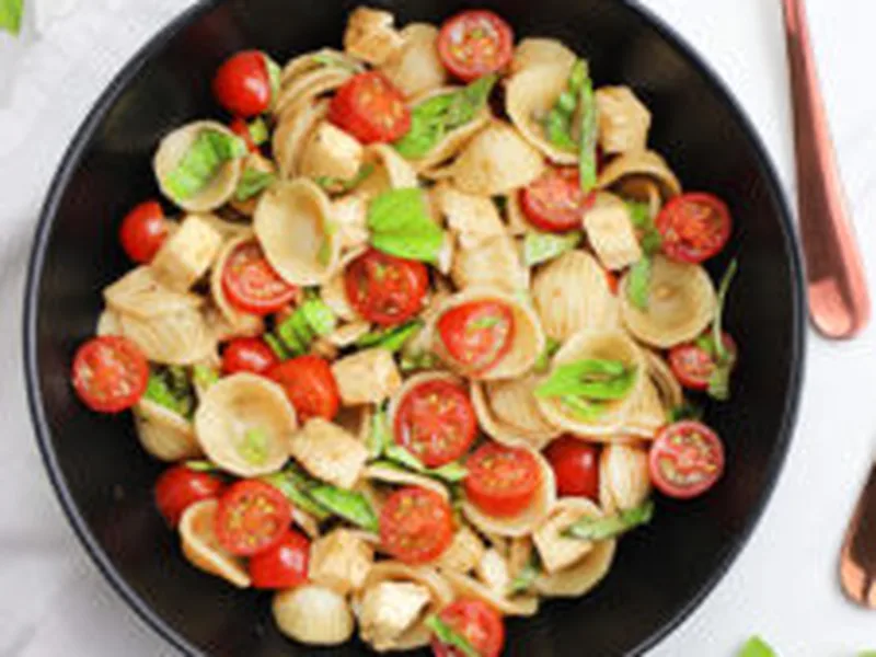 Chilled pasta salad combining orecchiette with ripe cherry tomatoes, fresh mozzarella or queso fresco, and aromatic basil. Dressed with olive oil and balsamic vinegar, finished with oregano and a optional drizzle of balsamic glaze. Light, refreshing, and adaptable to your cheese preference.