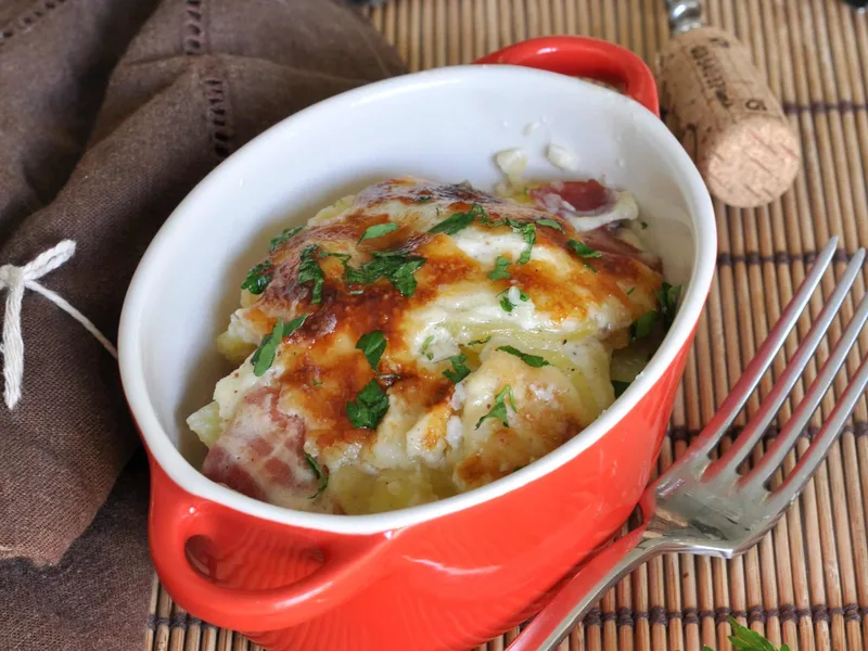 Tender potato slices layered with a silky béchamel sauce made from butter, flour, and whole milk, seasoned with nutmeg and topped with Parmesan cheese. Baked covered then uncovered until golden and bubbling. A classic comfort food side dish with optional broiling for a browned crust.