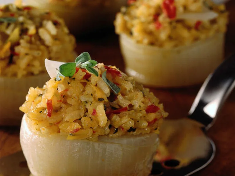 Prepare all components separately up to 1 day ahead; assemble and stuff onions up to 4 hours before serving.
