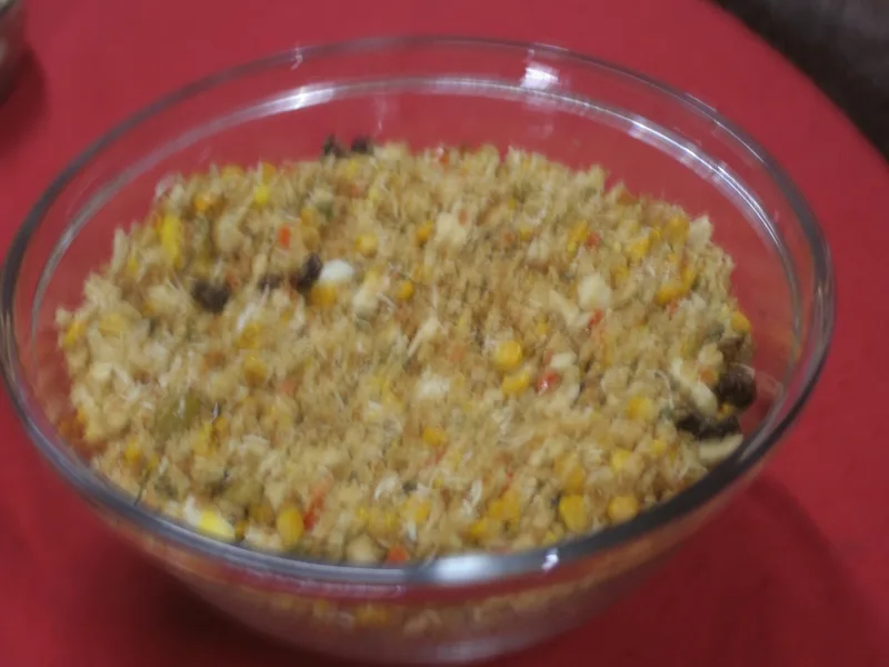 Brazilian-style toasted breadcrumb dish made from crushed cream crackers mixed with sautéed vegetables, corn, olives, raisins, eggs, and parmesan. Seasoned with garlic, peppers, and fresh herbs, then finished with margarine and hard-boiled eggs for a savory, textured side.