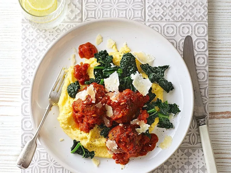 Succulent pork meatballs infused with fennel seeds, fresh rosemary, and bright lemon zest, simmered in a rich tomato sauce until the flavors meld and the sauce thickens. What sets this version apart is the aromatic fennel and herbs that add complexity beyond standard meatball recipes, creating depth with each bite. The texture is tender inside with a light golden crust from pan-browning. This dish suits home cooks seeking restaurant-quality comfort food without excessive effort. Serve it for weeknight dinners, casual gatherings, or meal prep. The finishing combination of creamy polenta, earthy cabbage, and sharp parmesan shavings enhances simple meatballs into a well-balanced, satisfying meal.