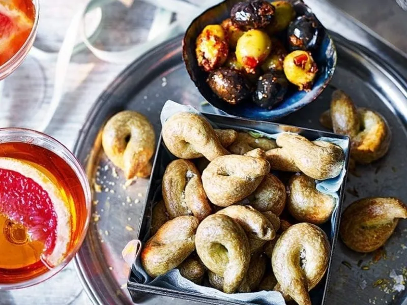 Italian fennel-seed crackers made with a simple dough of flour, olive oil, and white wine. The dough is kneaded, rested, then shaped into loops, briefly boiled to create a chewy interior, and finished in the oven until golden and crisp. Serve as an aperitivo or gift.