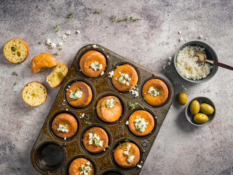 Tangy feta and briny green olives baked into tender savory muffins. Eggs and milk create a custardy crumb, while butter ensures a golden exterior. Mixed by hand and baked in a muffin tin until puffed, these are finished with crumbled feta scattered on top while still warm.