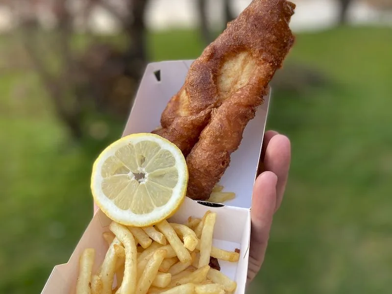 Crispy beer-battered cod served with golden fried potatoes and lemon. A German-style take on the classic featuring a savory BBQ rub in the batter, fried to golden brown in a Dutch oven at precisely controlled temperature.