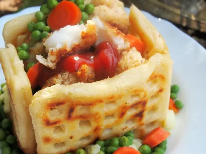 A playful, interactive fish dish that transforms simple ingredients into an edible treasure chest, engaging children through imaginative plating. Coley nuggets, crispy-fried and golden, nestle inside a potato waffle structure held together with creamy mashed potato. Garden peas and carrot rounds represent emeralds and pieces of eight, turning nutritious vegetables into treasure. The contrast between crispy waffles and tender fish, combined with soft mash and sweet carrots, creates varied textures children enjoy. This version emphasizes the theatrical presentation—assembling the chest becomes part of the meal experience, encouraging kids aged 7-12 to participate in construction. Potato waffles provide structural integrity and quick cooking, while the beaten-egg coating ensures nuggets stay moist inside their golden crust. Serve with tomato ketchup for dunking. Perfect for weeknight family dinners when you need nutrition disguised as adventure.