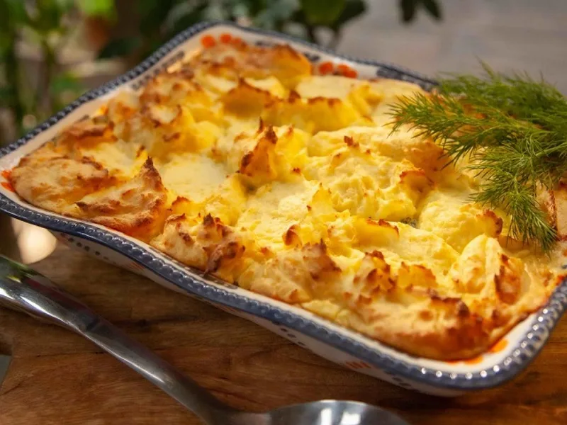 Creamy baked fish pie layered with smoked salmon, cod or pollock, and tiger shrimp, finished with whipped potato topping. A classic Polish comfort dish from chef Ewa Wachowicz with dill and chive beurre blanc sauce, baked until golden.