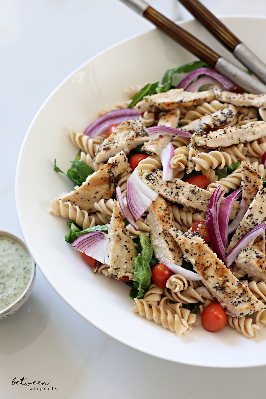 Seasoned chicken cutlets with everything bagel spice paired with whole wheat pasta, crisp romaine, cherry tomatoes, and red onion tossed in a basil-lemon mayo dressing. Quick weeknight dinner combining protein and greens in one bowl.