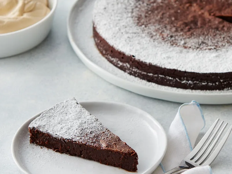 A rich, dense flourless chocolate cake infused with espresso, baked in a water bath for a fudgy center. Bittersweet chocolate and instant espresso powder create deep, complex flavors balanced by subtle sweetness. Topped with espresso-spiked whipped cream and a dusting of powdered sugar. Perfect for dinner parties, special occasions, or when you want an impressive dessert that proves chocolate can be elegant. This version uses a springform pan and water bath technique to ensure a moist, cake-like texture with an almost mousse-like crumb.