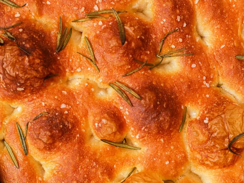 A soft, dimpled focaccia made without kneading, using folding techniques and long fermentation. Topped with rosemary, coarse salt, cheese, and tomatoes. Ready in about 2.5 hours with minimal hands-on work. The wet dough develops structure through gentle folds and proves twice before baking until golden.