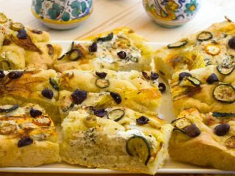 Focaccia with Zucchini, Blossoms, Ricotta & Olives