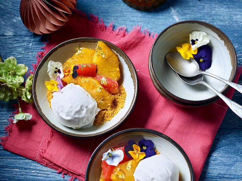 Wok-seared pineapple glazed with Canadian maple syrup and lemongrass, served warm over crushed ginger biscuits with citrus segments and coconut ice cream. Topped with edible gold leaf and flowers for an elegant, aromatic dessert with contrasting textures.