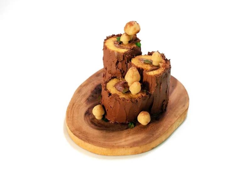 A showstopping traditional French buche de Noel featuring a delicate sponge cake rolled with silky chocolate buttercream, topped with whimsical marzipan mushrooms and cocoa dust. The cake is assembled to resemble a log with bark-like texture. Serve this elegant dessert at winter celebrations or holiday gatherings. This version balances the rustic woodland aesthetic with refined French pastry technique, requiring multiple components and careful assembly.