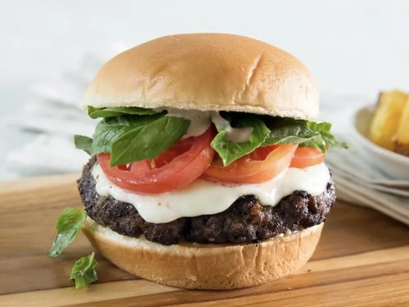 Charred ground beef patties topped with melted mozzarella, ripe tomato slices, fresh basil, and tangy balsamic glaze on toasted buns. A sophisticated take on the classic burger combining Italian flavors with backyard grilling. Ready in under 20 minutes for four servings.