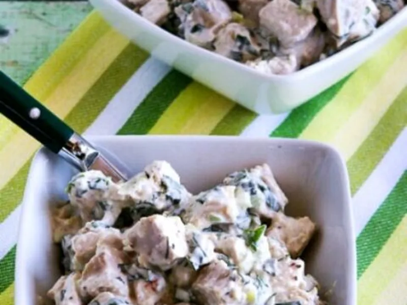 A creamy chicken salad brightened with fresh basil, green onions, and a tangy buttermilk-mayo dressing enhanced with Parmesan cheese. Perfect for lunch sandwiches, wraps, or served over greens. The combination of fresh herbs and cheese creates a more sophisticated flavor than traditional chicken salad, making it ideal for casual entertaining or meal prep.