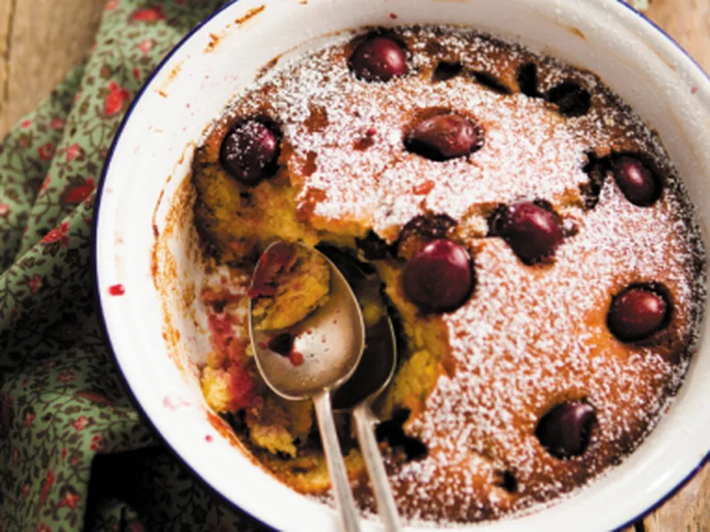 A delicate gluten-free clafoutis showcasing fresh cherries suspended in a custardy batter made with corn and rice flour. The eggs and crème fraîche create a light, mousse-like base that bakes into a golden, slightly jiggly center. Quick to prepare, impressive to serve.