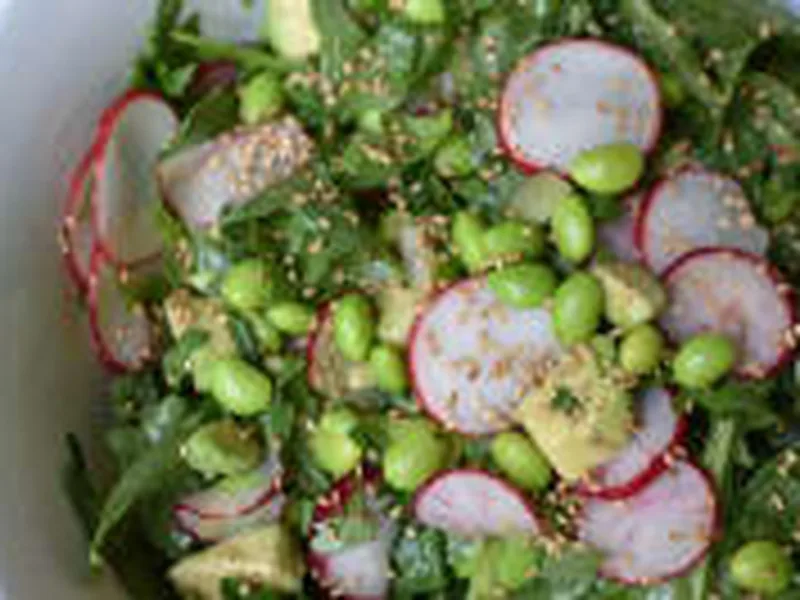Place edamame, green onions, parsley, radishes, arugula, and avocado in a medium bowl and toss gently to blend