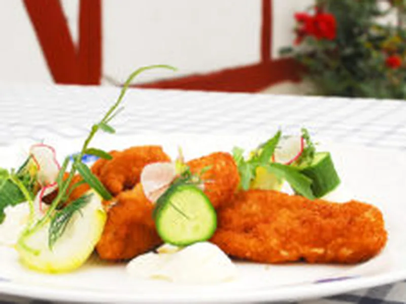 Bread the chicken up to 4 hours ahead, refrigerating on a tray. Make dressing up to 1 day ahead. Fry just before serving for maximum crispness.