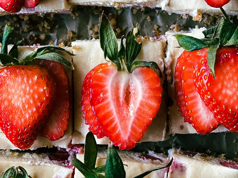 Dairy-free frozen cheesecake bars with a pecan-date crust and creamy cashew filling studded with fresh strawberries. No baking required. Make ahead and freeze for an easy vegan dessert that cuts into neat squares.