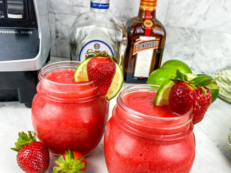 Blended frozen strawberry margarita made with fresh lime juice, white tequila, and orange liqueur. Smooth, frosty cocktail garnished with lime wheels and fresh strawberries. Adjust consistency with ice or water to preference.