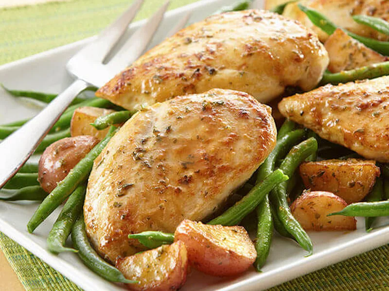 Serve chicken with potatoes and green beans.