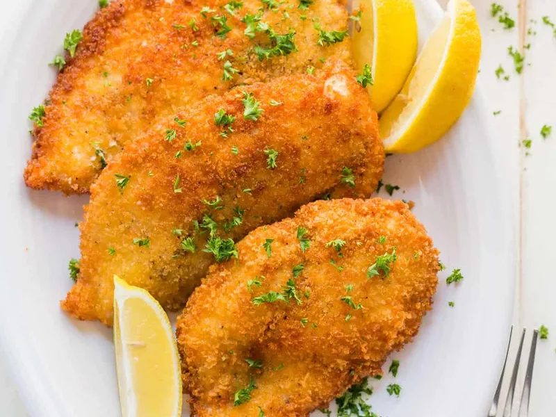 Heat a large, deep, heavy-bottomed pan or Dutch oven over medium heat. Add 1/4 inch of oil. Once oil reaches 350 degrees Fahrenheit or sizzles when a bread crumb is added, carefully place breaded chicken in batches to avoid crowding.
