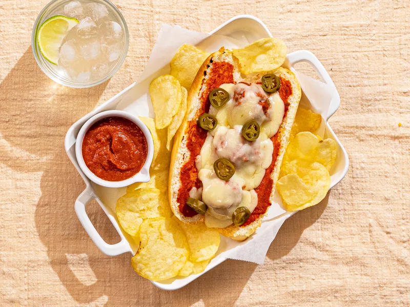 Homemade vegan meatballs seasoned with garlic, jalapeño, and Italian herbs, seared until golden then simmered in marinara. Assembled on hoagie rolls with melted provolone and broiled until bubbly. Customize heat level with fresh jalapeño toppings.