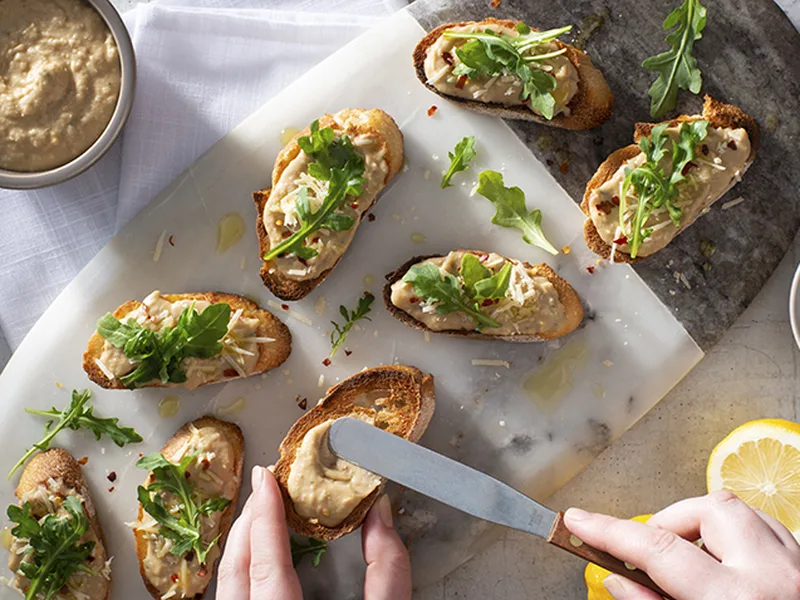 Creamy cannellini bean puree infused with roasted garlic, lemon, and fresh rosemary spread on toasted baguette rounds. Topped with peppery arugula, Parmesan, and a drizzle of olive oil for a bright, herbaceous appetizer that's ready in minutes.