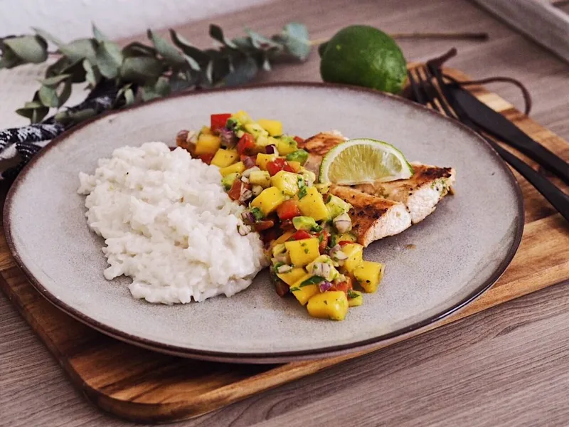 Pan-seared salmon fillet marinated in lime zest, lime juice, garlic, and olive oil, served with creamy coconut jasmine rice and a fresh salsa of diced mango, avocado, red bell pepper, and red onion finished with lime juice and coconut water.