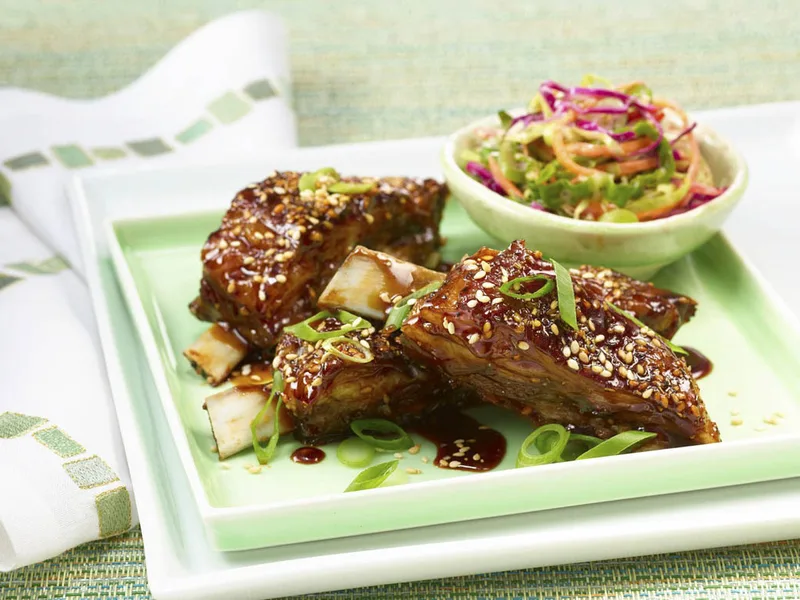 Place ribs on serving dish, drizzle with sauce and sprinkle with remaining sesame seed and green onions